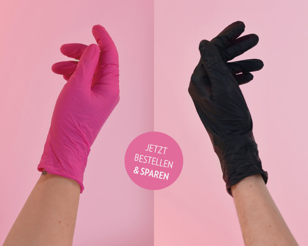 Schützende -NITRIL-Handschuhe in schwarz oder magenta für hautschonendes Arbeiten im Salon zum Sonderpreis. Beide Handschuhe gibt es in den Größen S, M und L in Boxen zu 100 Stück. Im März und April spart man 20 %.